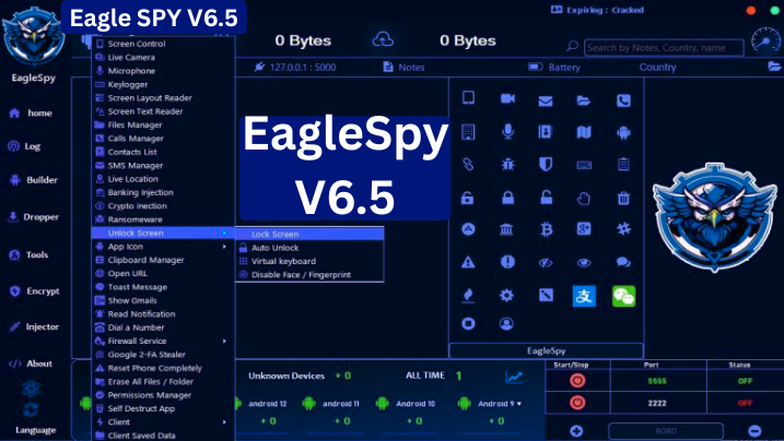 EagleSpy v6.5 is an advanced type of powerful Android device hacking program that works remotely worldwide. It allows you to steal crypto apps automatically, also lets you bypass banking apps, black screen bypass, unlock screen, steal websites login, bypass play protect and other antiviruses, and control victim’s mobile silently.